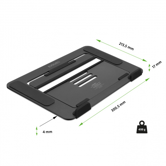 Skládací design dává podstavci EVOLVEO TopLift do vínku cestovatelskou duši. Ve složeném stavu tato pomůcka měří jen 4 mm na výšku (bez opěrek), takže se vám v tašce či batohu skoro ztratí. Díky ultralehké skládací konstrukci ho složíte, přenesete a znovu rozložíte během chvíle – jako když otevřete knihu, abyste se vrhli na další kapitolu. Rozměry 300,5 × 213,5 × 4 mm a hmotnost 499 g dělají z tohoto podstavce pod notebook ideálního parťáka pro všechny, kteří střídají kancelář, home office, coworking a kavárnu. Všude tam si s ním totiž snadno obstaráte vlastní pracovní místo, na které jste zvyklí.SPECIFIKACE :