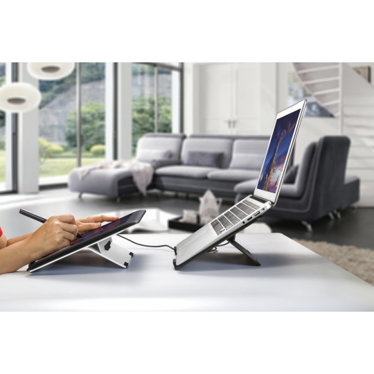 • Univerzální konstrukce pro notebooky a tablety až do 16" • Pasivní systém chlazení s efektivním odvodem tepla a optimalizovanou cirkulací vzduchu • Extra velký chladicí otvor 22 × 16,1 cm • Výškově polohovatelný do 3 úhlů (22°/30°/40°) • Ultralehká konstrukce z odlehčeného leteckého hliníku (hmotnost pouhých 499 g) 1) Garantuje torzní stabilitu 2) 100% odolná proti korozi 3) Dlouhá životnost • Skládací konstrukce ideální pro jednoduchý a komfortní přenos • Silikonové opěrky pro spodní hranu notebooku (šířka 4,6 cm) zabraňují: 1) Poškrábání notebooku 2) Nechtěnému sklouznutí při manipulaci 3) Pohybu notebooku při psaní • Silikonové postranní bloky eliminující poškrábání spodní části notebooku • Protiskluzové silikonové patky výklopné části pro maximální stabilitu na stole • Ultraslim provedení (výška ve složeném stavu pouhé 4 mm bez opěrek) • Ergonomicky polohovatelná konstrukce garantuje: 1) Správně držení těla 2) Zmírnění bolesti zad a očí • Systém chlazení DoubleFlow přes dva ultravelké chladící otvory zajišťuje: 1) Vynikající cirkulaci vzduchu 2) Odvod tepla 3) Stabilní teplotu notebooku • Materiál: hliník + silikon • Tloušťka hliníku: 3,75 mm • Nosnost: 10 kg • Výška včetně zarážek: 17 mm • Rozměry (š × h × v): 300,5 × 213,5 × 4 mm • Hmotnost: 499 gOBSAH BALENÍ :