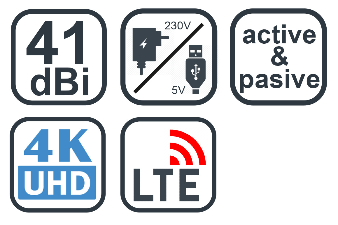 • zisk: 41 dBi • filtr LTE • VHF: 87,5-230MHz (FM/DAB+) • UHF: 470-694 MHz (DVB-T2) • napájení AV 220-240V, DC 5V/200mA • konektor IEC male • velikost: 220 x 200 x 2 mmOBSAH BALENÍ: