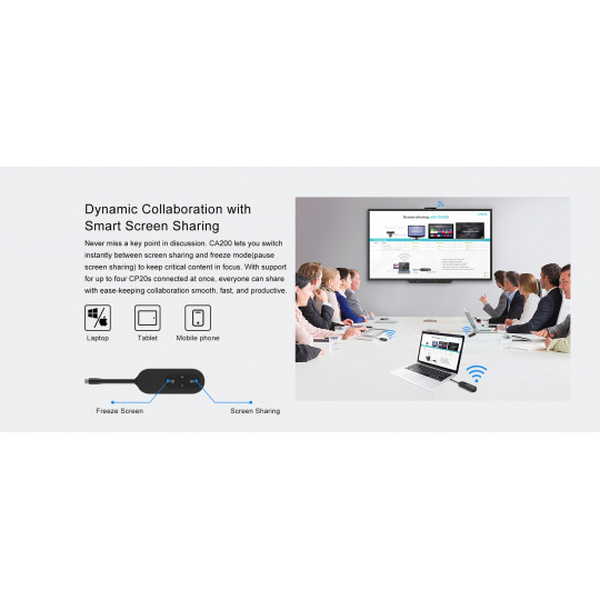 Nikdy nezmeškejte žádný důležitý bod diskuse. CA200 vám umožňuje okamžitě přepínat mezi sdílením obrazovky a režimem zmrazení (pozastavení sdílení obrazovky), abyste se mohli soustředit na důležité obsahy. Díky podpoře až čtyř připojených zařízení CP20 najednou může každý snadno sdílet své obsahy, což zajišťuje plynulou, rychlou a produktivní spolupráci.