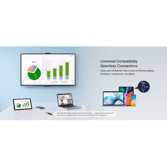 Linkvil CA200 je bezdrátová konferenční sada navržená pro zjednodušení nasazení a zvýšení efektivity schůzek. Díky integrovanému vysílači a přijímači může jeden rozbočovač CA200 současně připojit až čtyři pody pro sdílení obrazovky CP20 – není nutná žádná systémová integrace. Stačí jej zapojit a můžete začít s ním pracovat. Podporuje bezdrátové vysílání v rozlišení 4K a umožňuje bezproblémové přepínání do režimu zmrazení, což umožňuje plynulé prezentace a flexibilní spolupráci v různých scénářích. CA200 je kompaktní a přenosná, kompatibilní s více zařízeními, což pomáhá eliminovat nepořádek s kabely a vytvořit čistší a produktivnější prostředí pro schůzky.