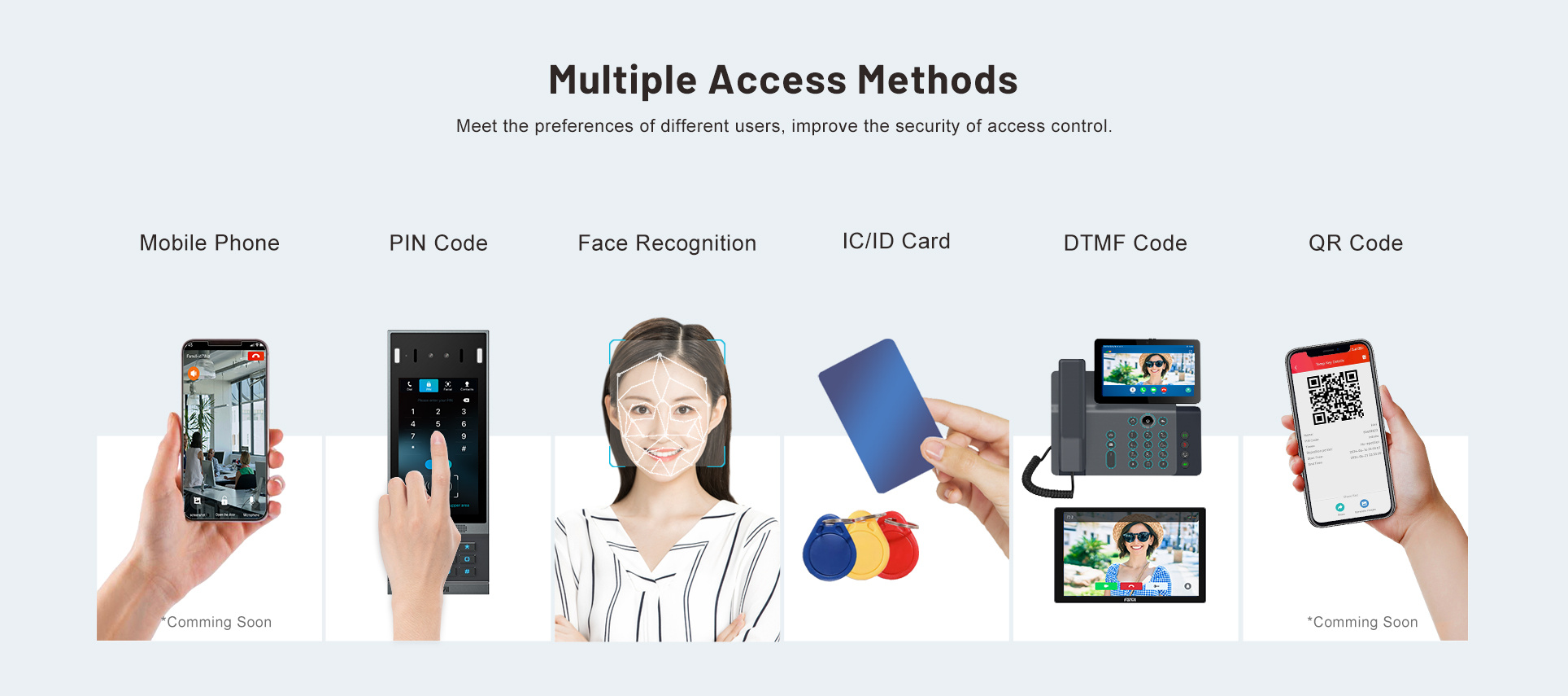- Podpora více metod přístupu: Rozpoznávání tváře, IC/ID karta, PIN kód, QR kód, DTMF, mobilní telefon