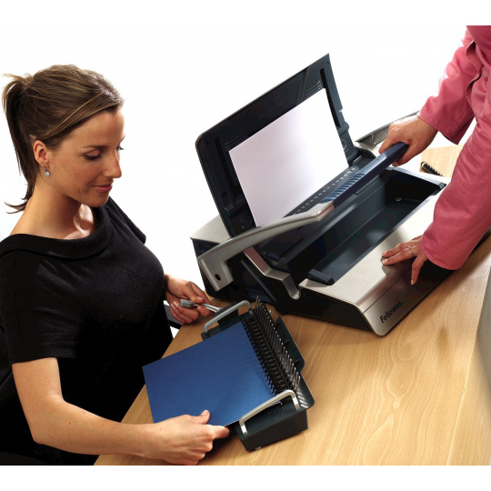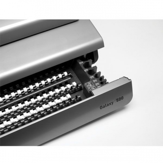 Jedinečné provedení robustního vázacího stroje s uživatelsky samostatně provozovatelnou vázací jednotkou nabízí model Fellowes Galaxy. Děrovací kapacita až 28 listů 80 g papíru. Kapacita vazby až 500 listů (do průměru hřbetu 50 mm). Možnost nastavení vzdálenosti děr od okraje svazku. Vyřaditelné perforační nože (pro formát A5).