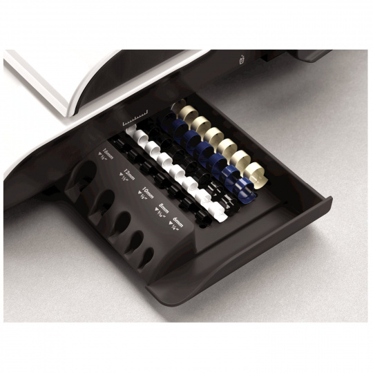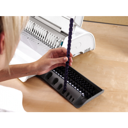 Stroj je vybaven větším zásobníkem na uložení několika plastových hřbetů a integrovanou měrkou pro správnou volbu průměru hřbetu. Průzor na čelní straně stroje slouží pro snadnou kontrolu zaplnění odpadního prostoru.