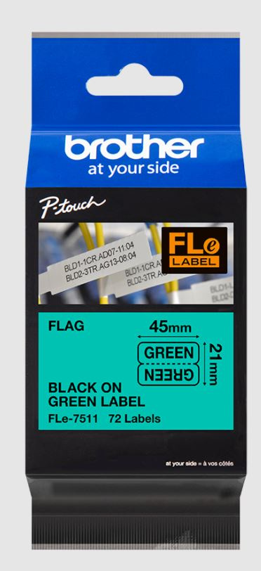 Tato kazeta s páskem FLe-7511 je vyvinuta pro snadné značení kabelů a vláken. *Černý text na zeleném předřezaném štítku *45 mm x 21 mm při tisku, 45 mm x 10,5 mm při nalepení *72 štítků na jedné pásce *Vysoce kvalitní originální štítky Brother *Jasné a trvanlivé výsledky Páska je vyvinuta pro snadné značení elektro, síťových a jiných kabelů, optických vláken,.. Jedná se o černý text na zeleném podkladu. Páska obsahuje 72 štítků s rozměry 45 mm x 21 mm (po nalepení jsou rozměry 45 mm x 10,5 mm). Tato popisovací černo-zelená páska FLe-7511 je ideální jak pro identifikaci kabelů tak pro univerzální použití. Jednoduše vytiskněte text nebo čárový kód na dvě části předřezaného štítku. Připevněte proužek štítku kolem kabelu, poté vezměte vytištěný předřezaný štítek a jednu polovinu přilepte na proužek štítku a poté jej přeložte přes druhou polovinu.