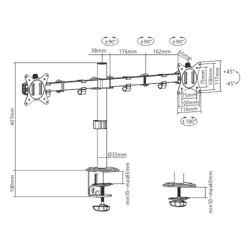 Suggested desktop thickness: clamp: 10 ~ 85 mm, grommet: 10 ~ 40 mm