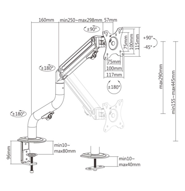 Suggested desktop thickness: clamp:10 ~ 80 mm, grommet:10 ~ 40 mm