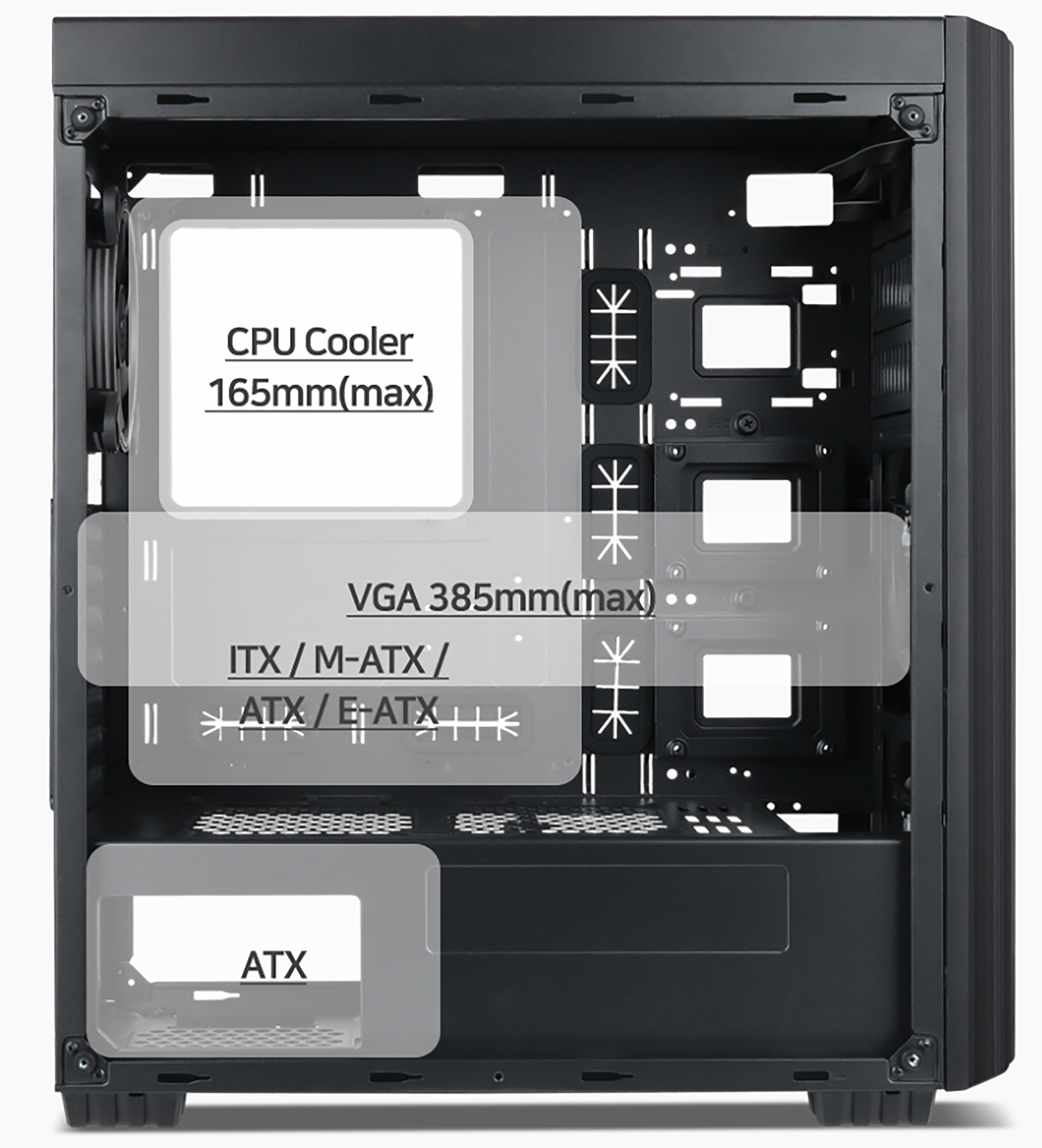 Podporuje základní desky: E-ATX, ATX, Micro ATX, mini - ITX