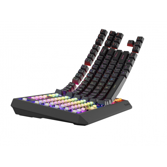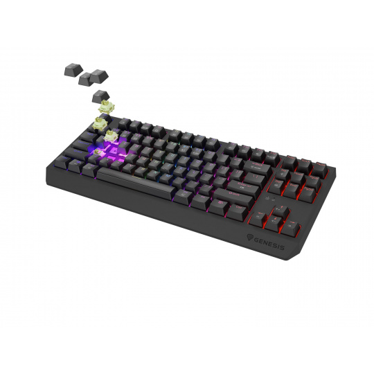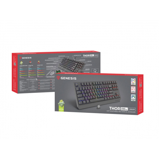 Klávesnice GENESIS Thor 230 TKL Wireless je vybavena různými typy spínačů. Každý z nich se vyznačuje vysokou přesností, aktivací bez ohledu na místo stisknutí klávesy a vysokou dynamikou. Víme však, že jako hráč můžete mít své vlastní preference. Proto jsme v GENESIS Thor 230 TKL Wireless implementovali hot - swap - techniku, která vám umožní vyměnit jakýkoli třípinový mechanismus za mikrospínač od společností jako Outemu, Akko, KTT. Jednoduše vytáhněte nainstalovaný mechanismus a zapojte nový. Díky systému Hot Swap také nemusíte kupovat novou klávesnici, když jeden spínač selže. Můžete jej vyměnit během několika sekund.