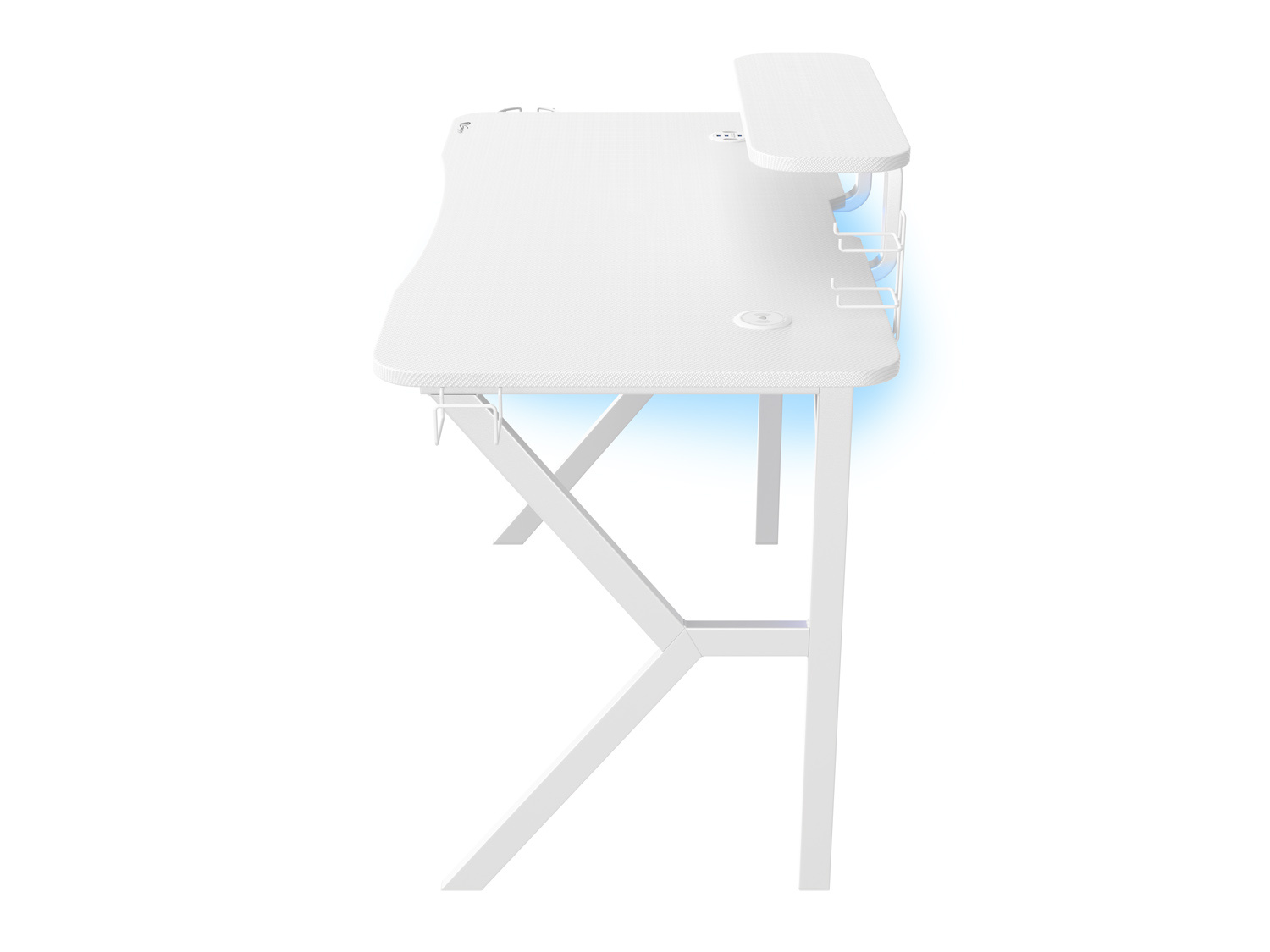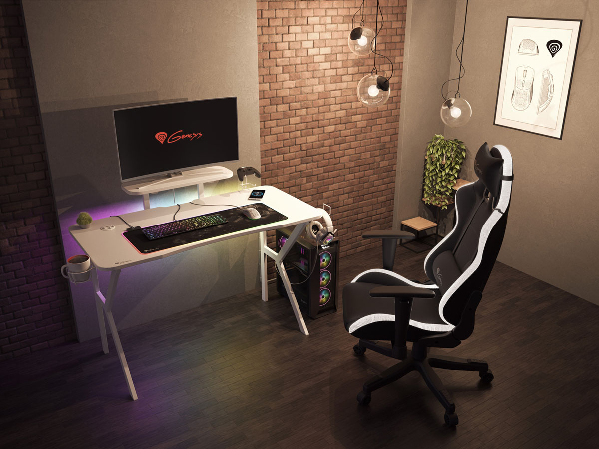 Každý prvek stolu je vyroben v bílé barvě. Karbonová povrchová úprava desky stolu v kombinaci s fenomenálním RGB podsvícením vám umožní vytvořit jedinečnou herní stanici. Přiložený dálkový ovladač vám umožní ovládat četné režimy a efekty podle vašich preferencí.