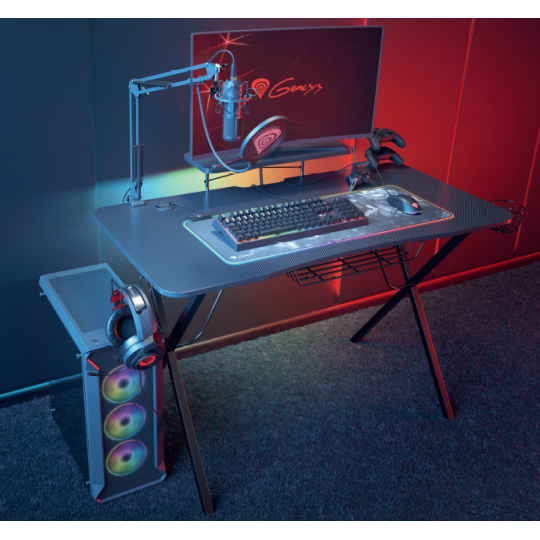 Genesis Holm 300 RGB je jedinečný stůl určený pro hráče her, který je vybaven množstvím dodatečných funkcí a praktických držáků, díky čemuž budete mít vaše příslušenství vždy po ruce. Navíc stůl obsahuje RGB podsvícení, které dává najevo, že se jedná o koutek skutečného hráče!