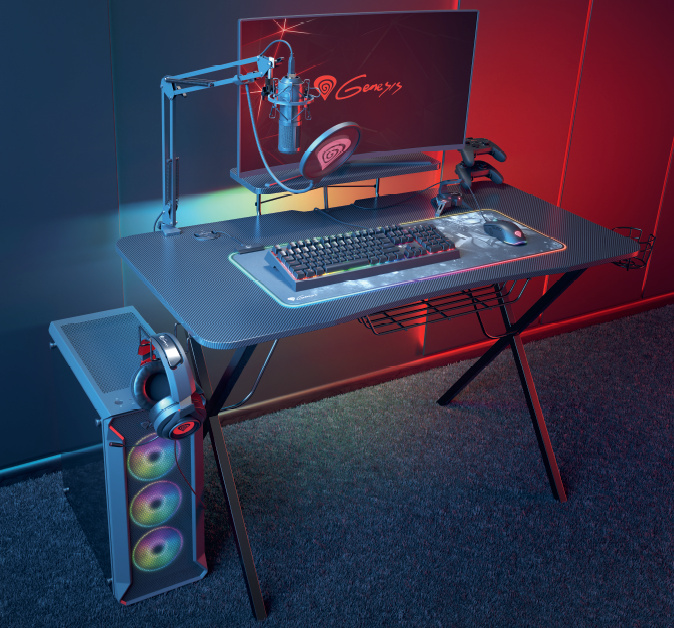 Genesis Holm 300 RGB je jedinečný stůl určený pro hráče her, který je vybaven množstvím dodatečných funkcí a praktických držáků, díky čemuž budete mít vaše příslušenství vždy po ruce. Navíc stůl obsahuje RGB podsvícení, které dává najevo, že se jedná o koutek skutečného hráče!