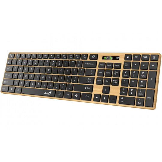 Genius SlimStar 7250BT představuje moderní bezdrátovou klávesnici s elegantním designem inspirovaným severským borovým dřevem. Nabízí duální připojení prostřednictvím Bluetooth 5.0 nebo 2,4GHz bezdrátové technologie s dosahem až 10 metrů. Klávesnice je ideální pro širokou škálu zařízení včetně stolních počítačů, notebooků, mobilních telefonů, tabletů i chytrých televizorů.