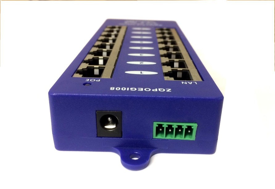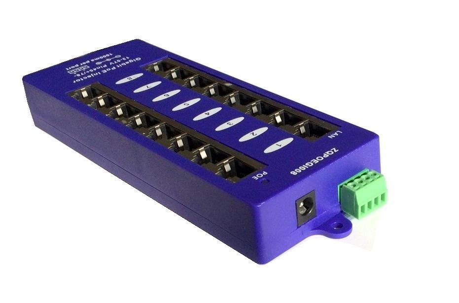 Panel integrující osm gigabitových pasivních POE injektorů s napájecím rozsahem 12-57V a max. proudem 1000mA/port.