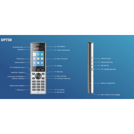Grandstream DP730 je bezdrátová DECT ručka, která v kombinaci s DECT základnou stejného výrobce, byla navržena pro každodenní užívání ve firemním segmentu, především ve skladových, maloobchodních prostorách, dohledových centrech, zdravotnických zařízeních, či sdílených kancelářích. Své místo si může najít i u náročných uživatelů v domácnosti.