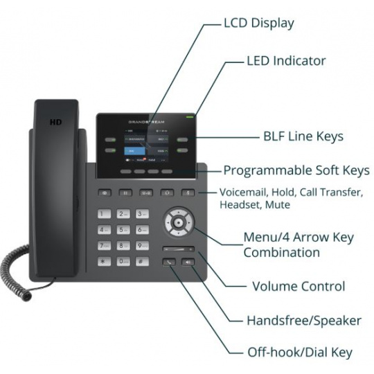 Grandstream GRP2612P, 2.4" TFT bar. displej, 2 SIP účty, 4 prog. tl., 16 BLF tl., PoE, 10/100Mbps