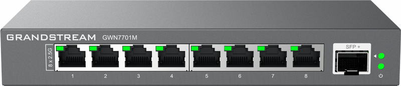 GWN7701M je unmanaged multi-Gigabit síťový switch, které poskytuje vysokorychlostní síťové připojení až 2,5 Gb/s pro home office a malé a střední firmy. Tento 8 portový multigigabitový switch podporuje rychlý Ethernet, 1-Gigabit a 2.5-Gigabit síťové rychlosti a zároveň obdsahuje 1 SFP+ Gigabit port, který poskytuje 1-Gigabit nebo 10-Gigabit vysokorychlostní uplinkové připojení k vaší síti.