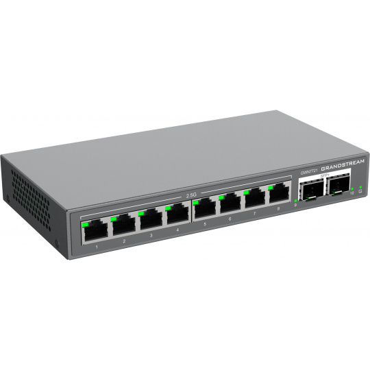 GWN7721 je 10portový managovatelný switch L2 Lite, vybavený 8x 2,5G ethernetovými porty a 2x 10gigabitovými SFP+ porty, vhodný pro malé a střední podniky pro budování škálovatelných, bezpečných a inteligentních sítí.