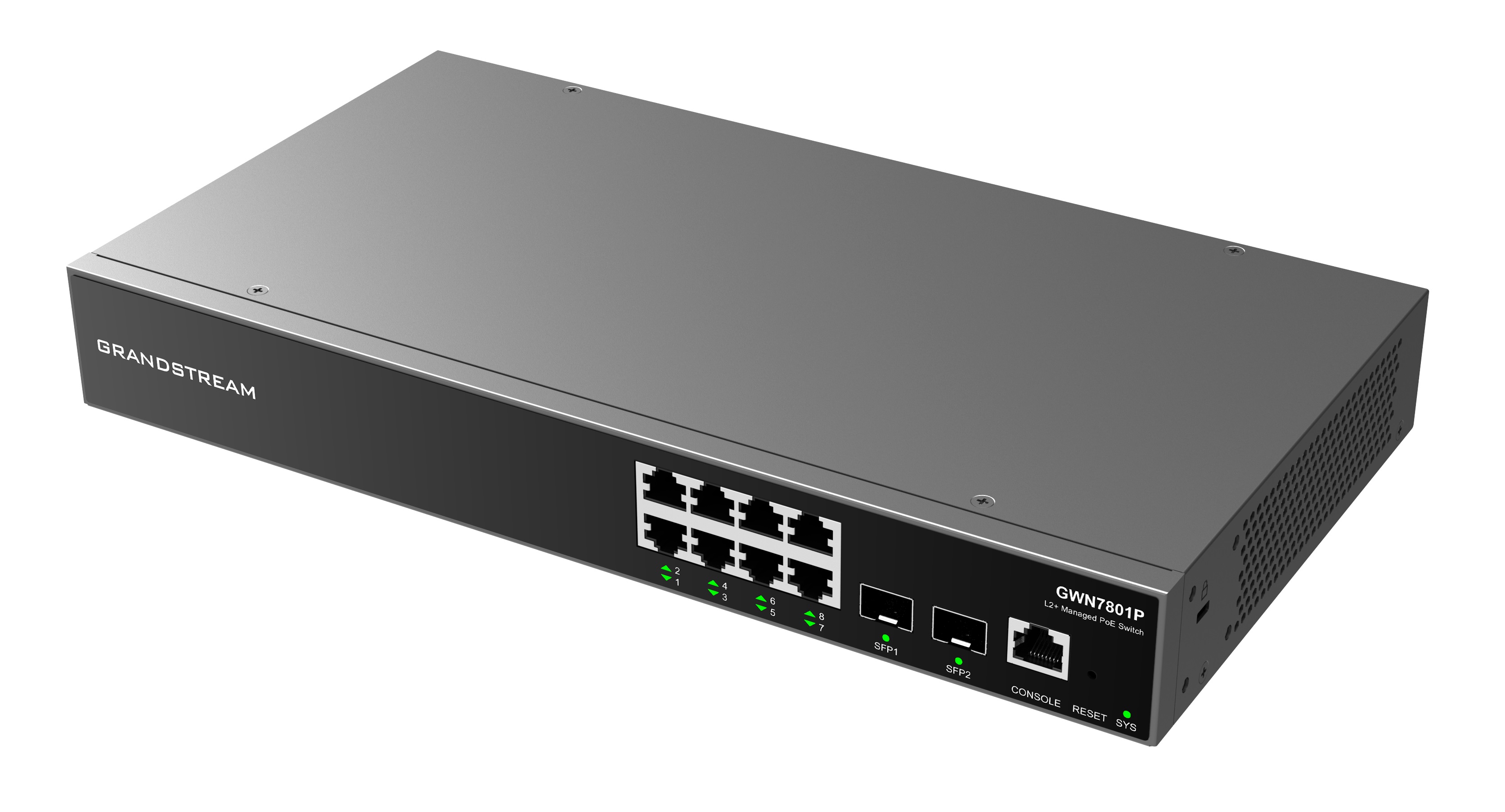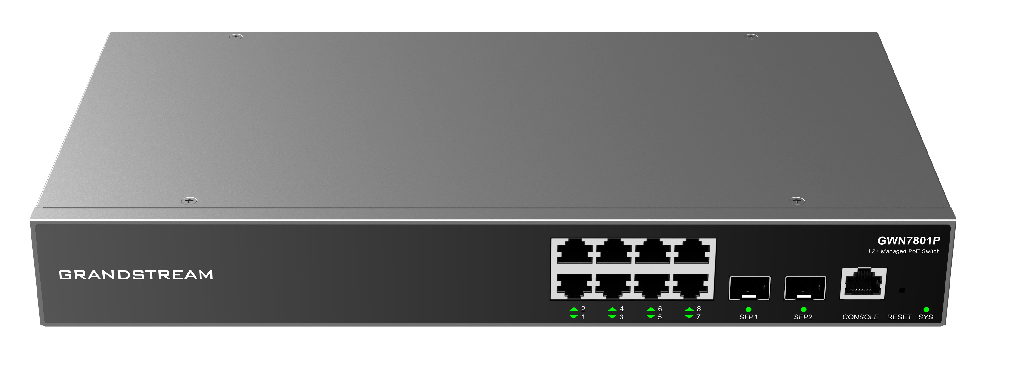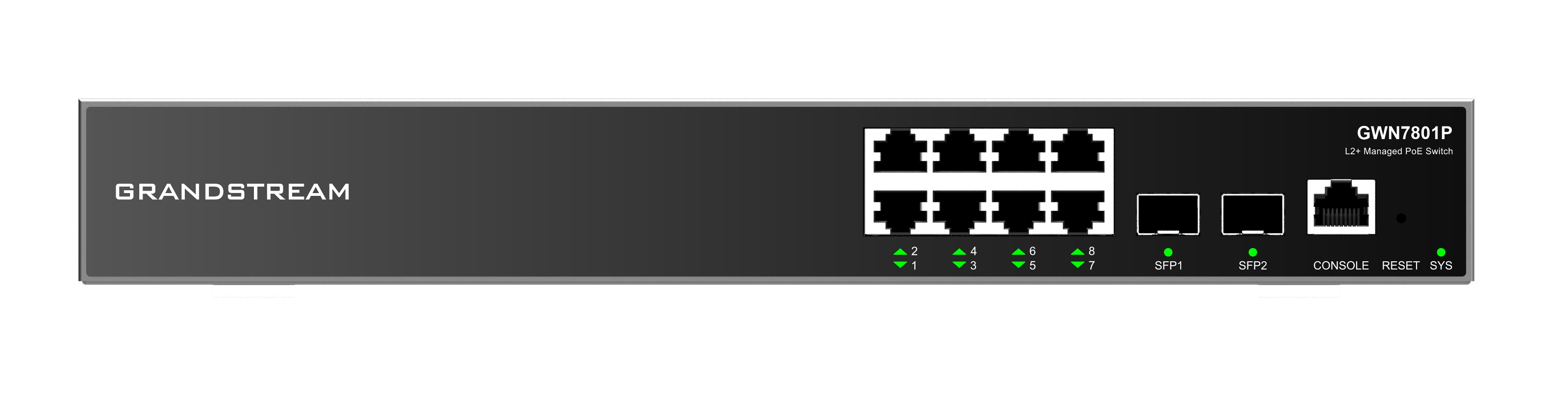 DatasheetGrandstream GWN7801P L2+ Managed Network Switch 8x 1Gb RJ45, 2x SFP, PoE+, DHCP, QoS, VLAN