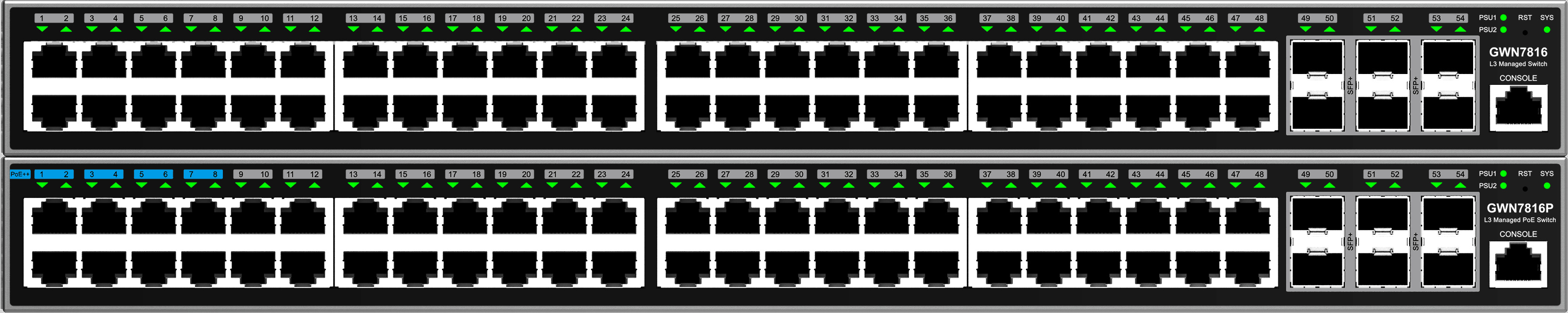 GWN7816 je 48portový síťový switch na 3. vrstvě, který umožňuje středním a velkým podnikům vybudovat škálovatelné, bezpečné, vysoce výkonné a inteligentní podnikové sítě, které lze plně spravovat. Podporuje pokročilou VLAN pro flexibilní a sofistikovanou segmentaci provozu, pokročilou QoS stanovení priorit síťového provozu, IGMP/MLD Snooping pro optimalizaci výkonu sítě a komplexní můžnosti zabezpečení proti potenciálním útokům.