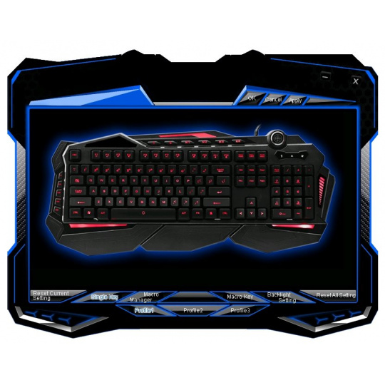 3 profily - na klávesnici naleznete klávesy pro přepínání mezi 3 nezávislými profily. Pro každý profil lze individuálně nastavit barva podsvícení, její intenzita, makra, předefinované klávesy...