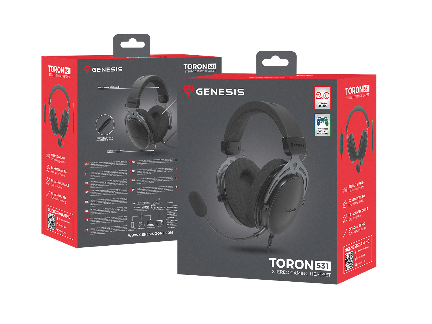 Genesis TORON 531 je multiplatformní náhlavní souprava. To znamená, že ji můžete snadno připojit k zařízením vybaveným 3,5mm konektorem. Navíc vám plně odnímatelný kabel a mikrofon usnadní přepravu a přídavný ovladač zase usnadní ovládání. V balení najdete také rozbočovač, který vám umožní připojit náhlavní soupravu k počítači vybavenému samostatným konektorem pro mikrofon a sluchátka.