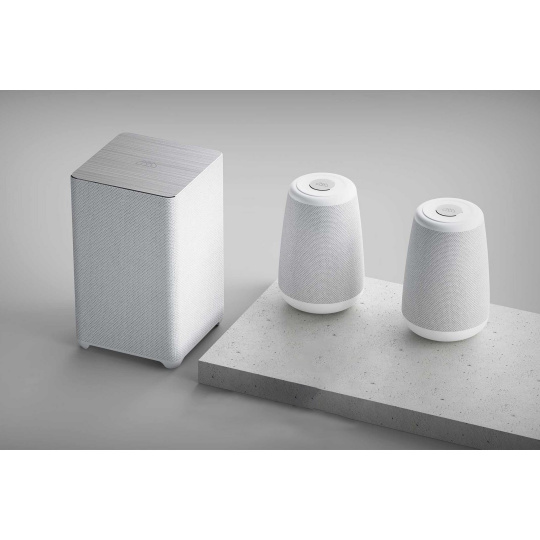 Homatics Sound&Sound 2.1 poskytuje bezdrátový stereofonní zvuk se 2 reproduktory umístěnými na levé a pravé straně zařízení (televizoru, monitoru atd.) a 1 subwooferem pro extra basy.
