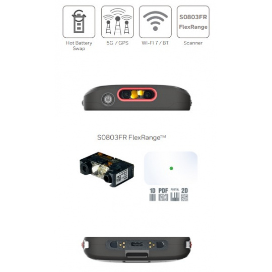 Profesionální mobilní terminál s Wi-Fi 7, rozšířenou baterií a FlexRange snímačem pro efektivní práci v logistice, výrobě i skladových provozech.