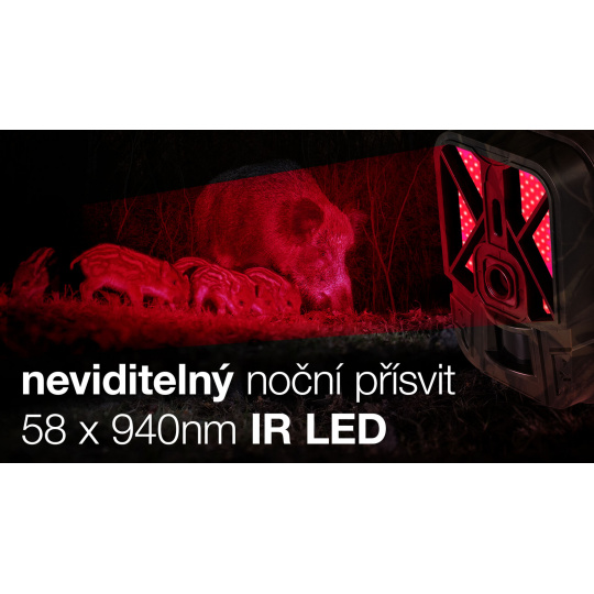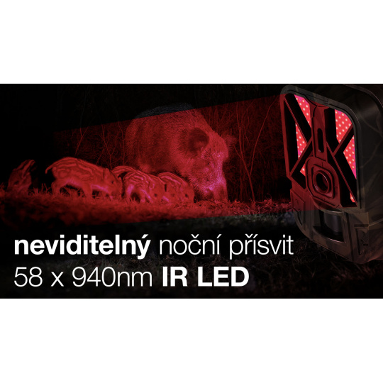 Infra noční přísvit je důležitá funkce každé fotopasti, díky 940nm LED diodám lze zařízení použít nejenom pro sledování zvěře, ale i k ostraze objektů, kdy narušitel není schopný v noci tento typ přísvitu pozorovat, na rozdíl od 850nm technologie. Díky 58 IR LED diodám s 940nm technologií dojde k velice dobrému osvětlení noční scény.