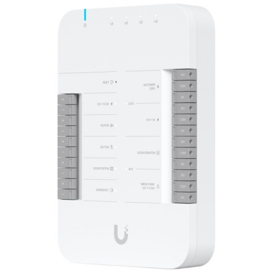 Rozhraní: 5× GbE RJ-45, 2× výstup pro zámek, 2× AUX výstup, 4× digitální vstup (pro senzory a tlačítka), 1× výstup DC 12 V/ 0,33A