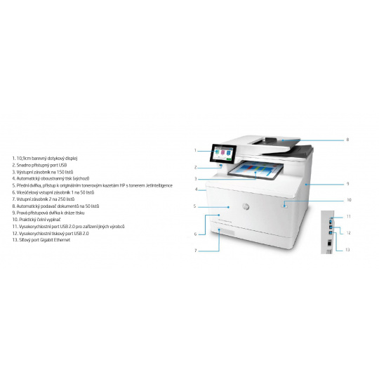 *Bezdrátové připojení: Volitelně, po zakoupení bezdrátového hardwarového příslušenství. Jednopásmová bezdrátová stanice a funkce Wi-Fi Direct jsou k dispozici u příslušenství HP Jetdirect 3100w BLE/NFC/Wireless 3JN69A