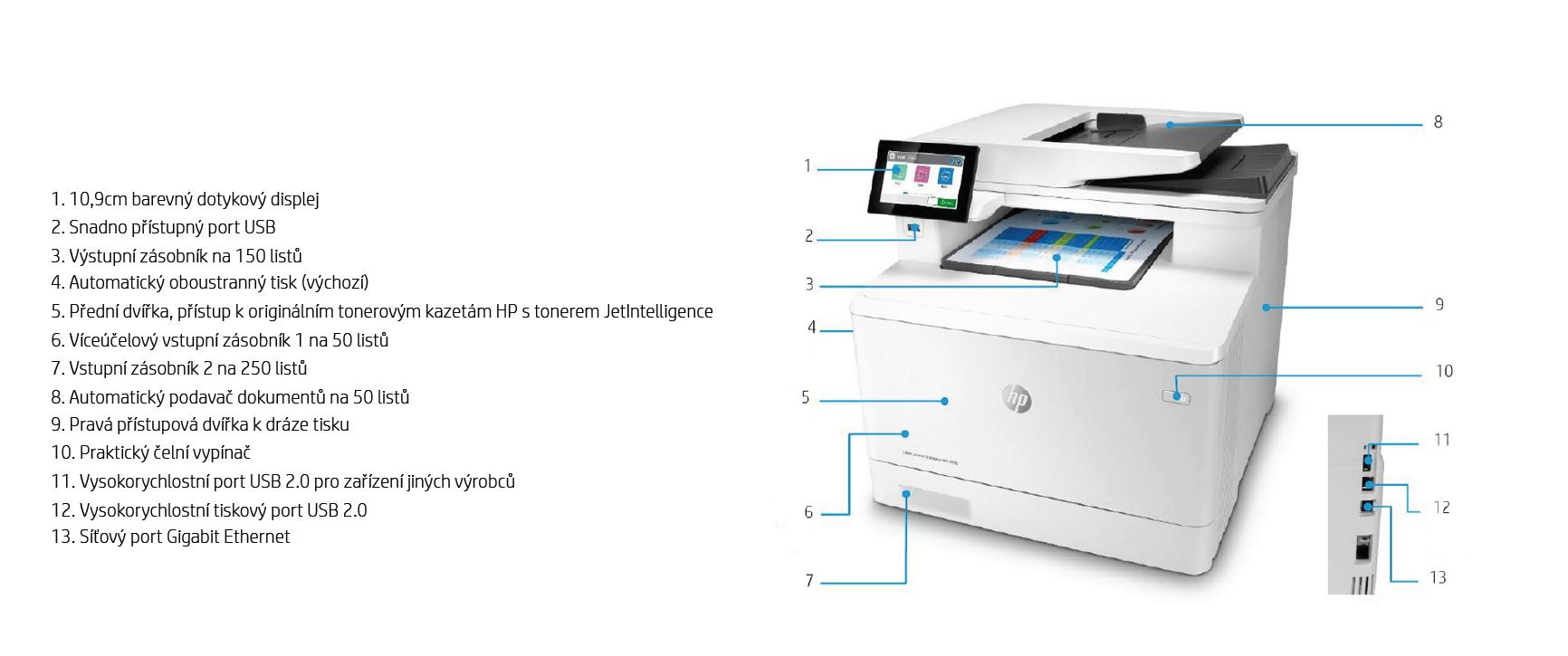 *Bezdrátové připojení: Volitelně, po zakoupení bezdrátového hardwarového příslušenství. Jednopásmová bezdrátová stanice a funkce Wi-Fi Direct jsou k dispozici u příslušenství HP Jetdirect 3100w BLE/NFC/Wireless 3JN69A