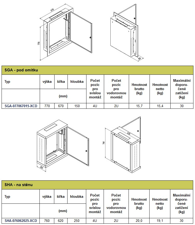 Hybridní rozvaděčové skříně pro realizaci domovních datových a silových rozvodů. IP20, nosnost 30 kg.