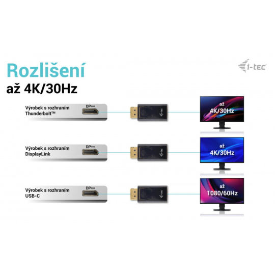 V případě připojení DisplayPort s rozhraním Thunderbolt bude maximální rozlišení 4K / 30 Hz (např. dokovací stanice i-tec nebo videoadaptéry s číslem produktu začínajícím na TBxxxxxxxxx).