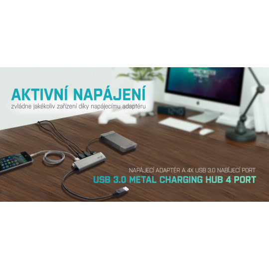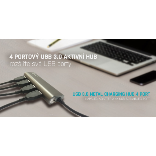 Tento HUB nabízí 4 USB 3.0 portů s funkcí Plug & Play a standardním USB nabíjením – HUB automaticky detekuje, jestli je připojeno zařízení pro USB nabíjení. Rozhraní USB 3.0 je důležité zejména pro datové přenosy z USB 3.0 paměťových karet a flash disků, kde se nejvíce využije jeho vysoká přenosová rychlost.