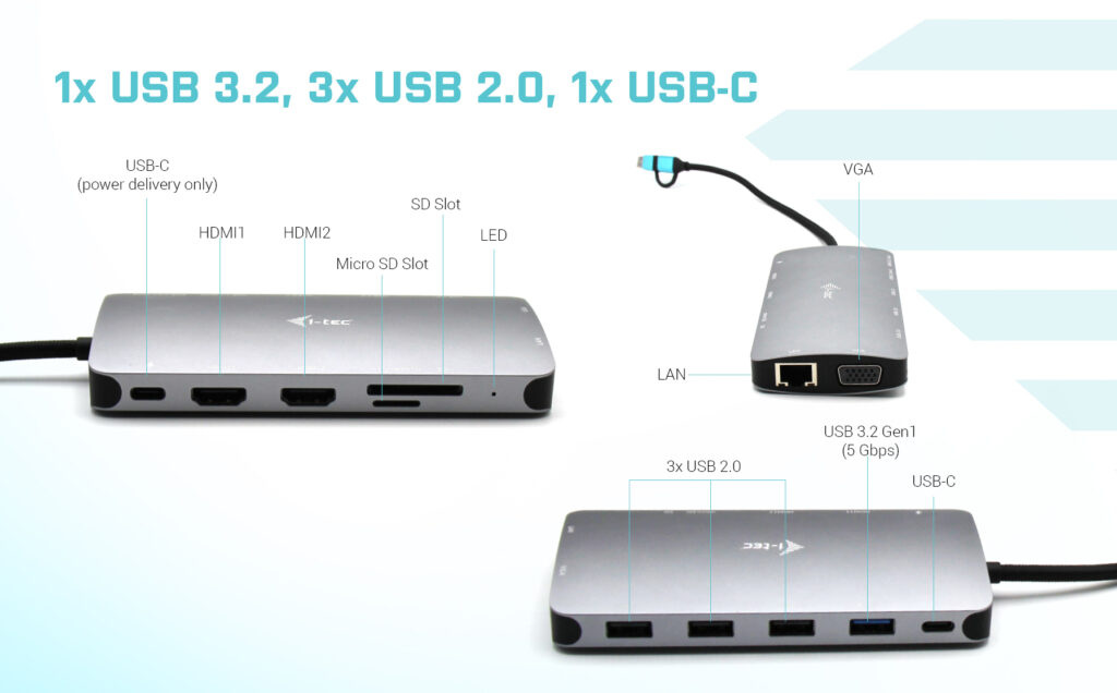 5 USB portů, spolehlivé a rychlé připojení do podnikové sítě díky integrovanému LAN portu a nativní podpora VGA, to vše z této dokovací stanice dělá ideálního společníka pro profesionály, kteří jsou na často na cestách a potřebují připojení i ke starším monitorům a projektorům. Samozřejmostí je podpora nabíjení vašeho notebooku či tabletu (a to až 100W).