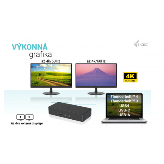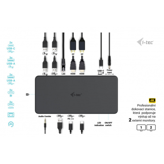 • Výkonná kancelářská dokovací stanice podporující superrychlé porty USB Gen 2 s rychlým nabíjením. Dokovací stanice podporuje výstup až na dva externí monitory ve vysokém rozlišení až 4K. Dokovací stanici lze použít prakticky se všemi notebooky, protože podporuje připojení ke všem běžným portům: 3.0, USB-C a Thunderbolt“ 3/4 a zároveň podporuje všechny běžné současné operační systémy.