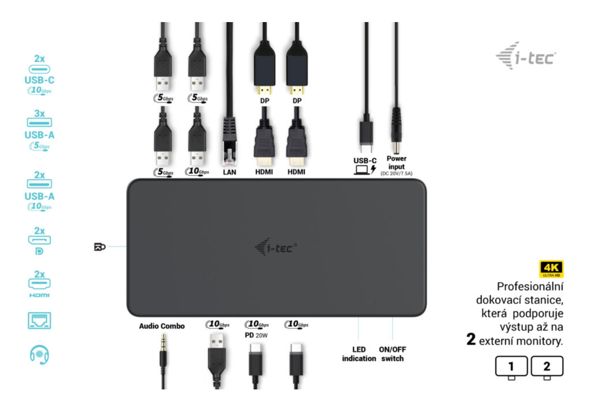 • Výkonná kancelářská dokovací stanice podporující superrychlé porty USB Gen 2 s rychlým nabíjením. Dokovací stanice podporuje výstup až na dva externí monitory ve vysokém rozlišení až 4K. Dokovací stanici lze použít prakticky se všemi notebooky, protože podporuje připojení ke všem běžným portům: 3.0, USB-C a Thunderbolt“ 3/4 a zároveň podporuje všechny běžné současné operační systémy.