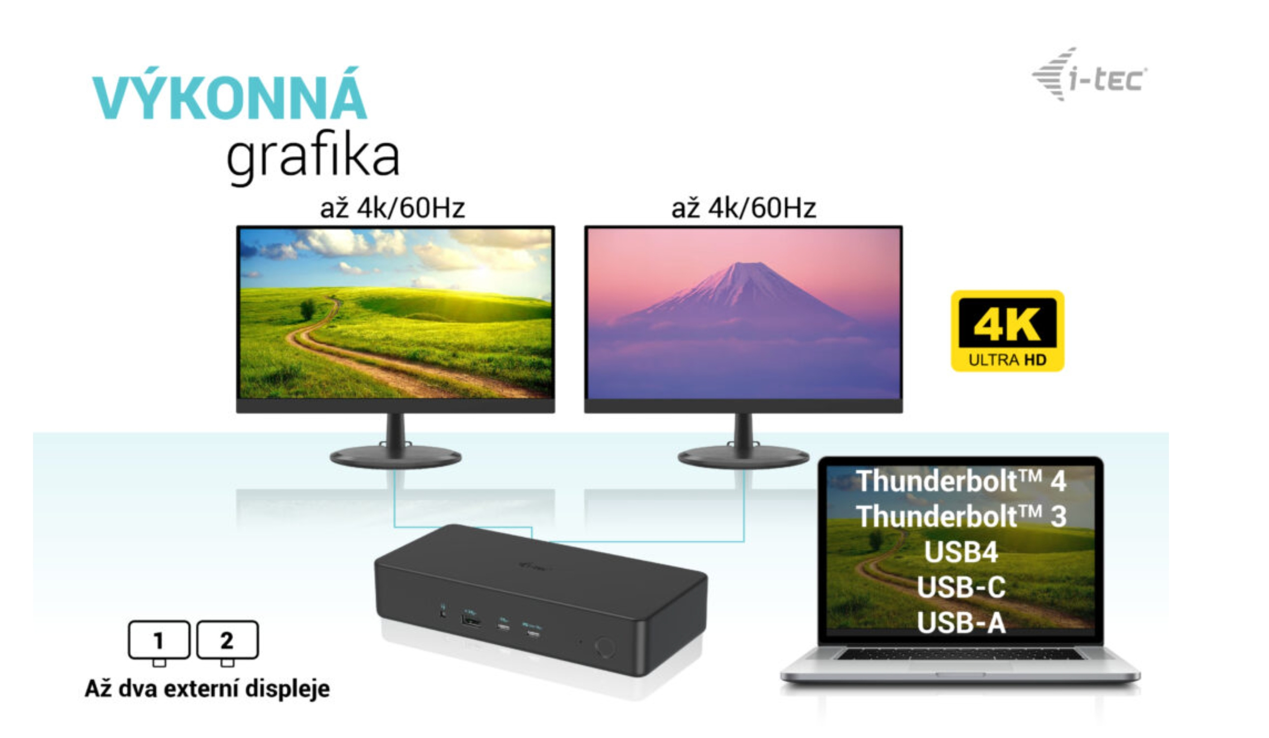 • Připojení 2 externích monitorů s rozlišením až 4K