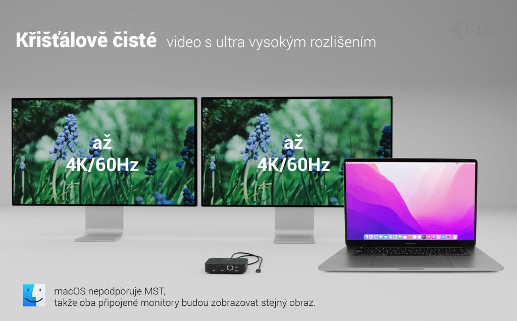 Moderní USB-C dokovací stanice pro kancelářské použití s podporou až dvou externích monitorů v rozlišení 4K. Stanice je kompatibilní s jakýmkoli notebookem vybaveným portem USB-C, USB4 nebo Thunderbolt 3/4/5. Nabízí 6 USB portů, spolehlivé a rychlé připojení k firemní síti díky integrovanému LAN portu a možnost instalace za monitor, což z ní dělá ideálního partnera pro profesionální použití. Samozřejmostí je také schopnost nabíjení notebooku nebo tabletu výkonem až 100 W.