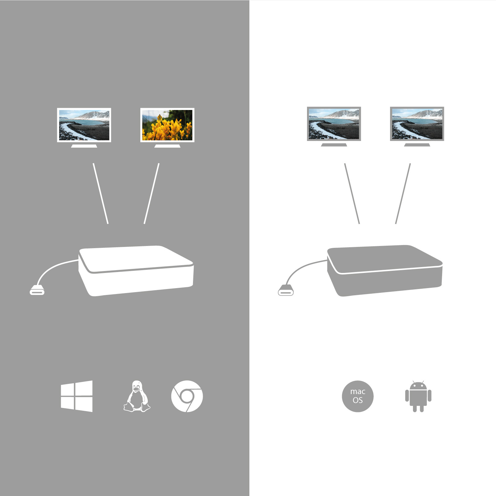 * Operační systém macOS nepodporuje technologii více-obrazového video přenosu Multi Stream Transport (MST), což znamená, že v případě připojení k macOS bude na obou připojených monitorech promítnut stejný obraz.