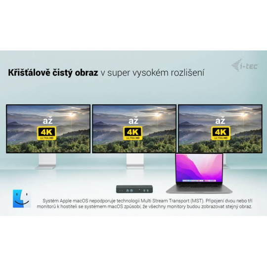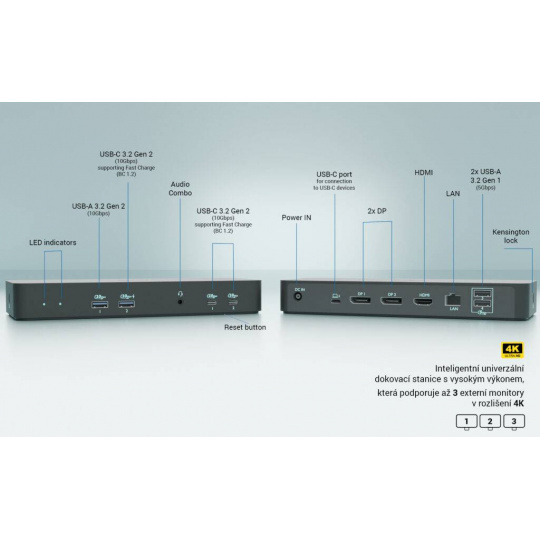 Vysoce výkonná dokovací stanice nové generace s USB-C, která podporuje připojení až tří externích monitorů v rozlišení až 4K. Lze ji použít s prakticky jakýmkoliv notebookem vybaveným porty USB-C, USB4 nebo Thunderbolt“ 3/4/5 a zároveň podporuje všechny běžné aktuální operační systémy.