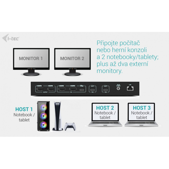 • Podpora až 3 hostitelských zařízení (2× notebook/tablet + 1× herní konzole/PC)