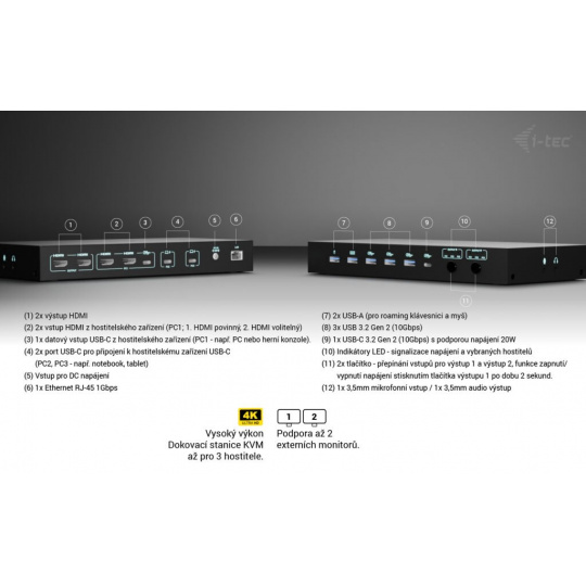 i-tec USB-C KVM Docking station for 3 Hosts, Dual Display, 2x Power Delivery (1x 92W/2x 65W)