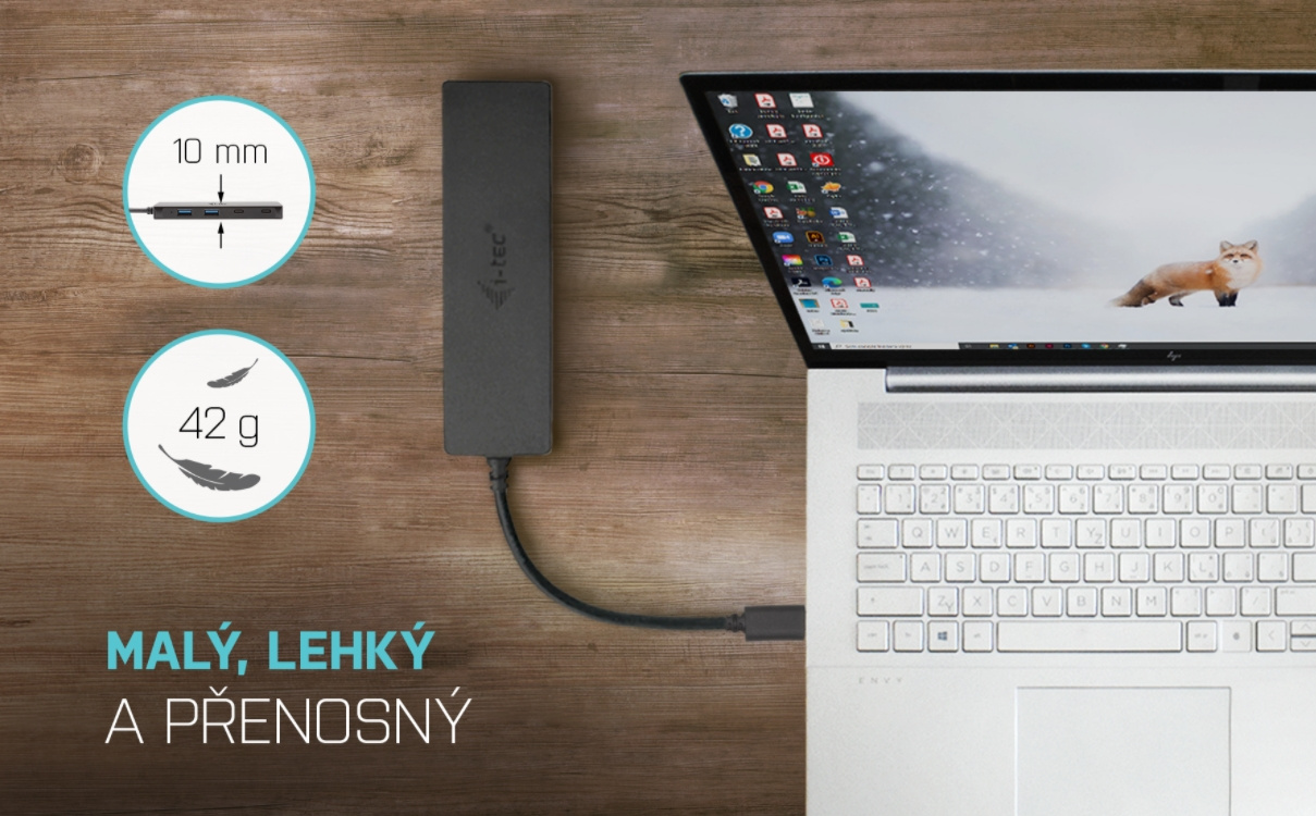 Hub nevyžaduje instalaci ovladačů, pouze jej pomocí USB-C kabelu připojíte a můžete jej ihned začít využívat. Hub má vestavěnou přepěťovou ochranu vašeho počítače pro případ zkratu na periferních zařízeních. Samozřejmostí je zpětná kompatibilita s USB 2.0. Díky kompaktním rozměrům a nízké hmotnosti jej můžete mít v brašně stále sebou – kovový povrch ostatně chrání hub před poškozením a před poškrábáním.