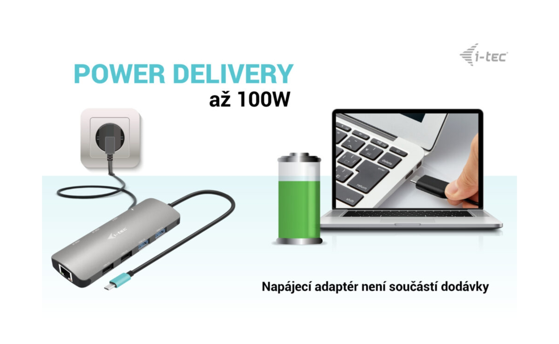 • Dokovací stanice podporuje až 100W napájení připojeného notebooku nebo tabletu (nabíječka USB-C není součástí dodávky)