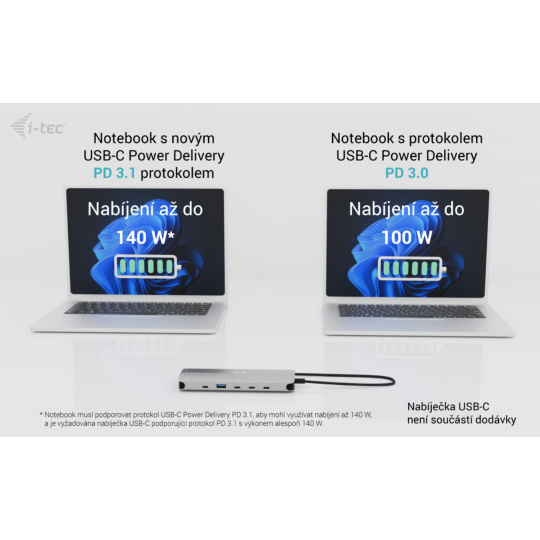 • * Pokud váš notebook nebo tablet podporuje nový a moderní nabíjecí protokol USB-C Power Delivery PD 3.1, dokovací stanice nabídne nabíjecí výkon až 130 W (pokud máte PD 3.0, nabíjecí výkon bude až 100 W).