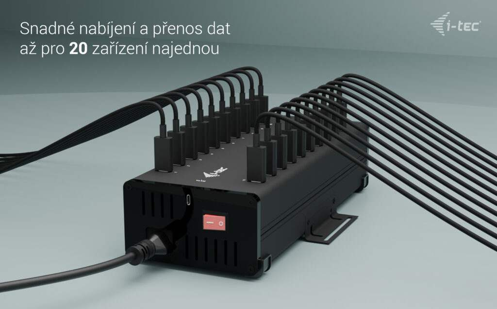 Tento moderní HUB nabízí 20 USB-C s funkcí Plug & Play a nabíjením až 15W na port. Díky tomu, že HUB má 20 USB portů, je možno nabíjet až 20 zařízení najednou.