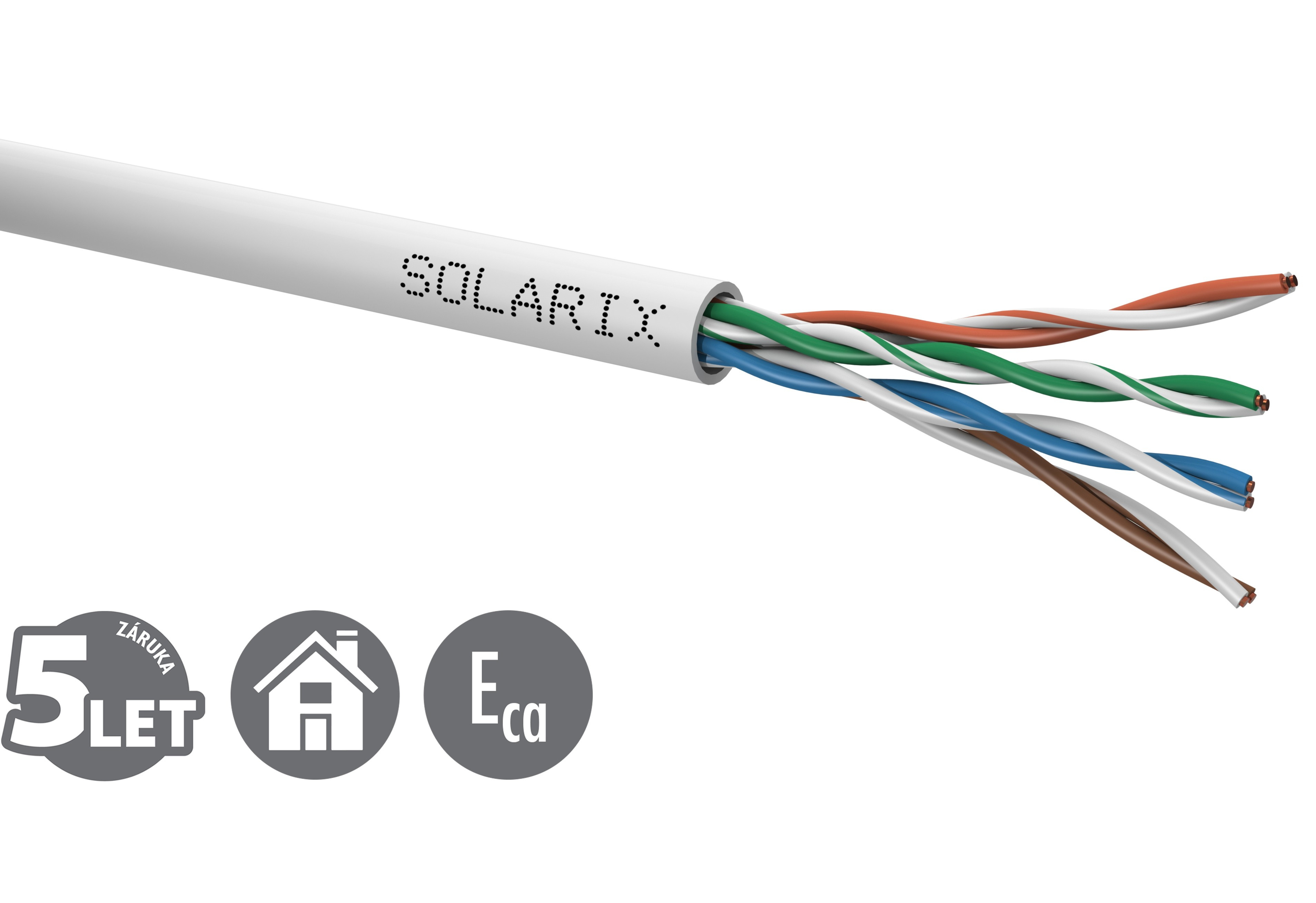 Instalační kabel Solarix s označením SXKD-5E-UTP-PVC je spolehlivý nestíněný kabel kategorie 5E, který je určený pro provoz ethernetových protokolů, včetně 2.5GBASE-T a 5GBASE-T*. Konstrukce kabelu je U/UTP, typ pláště PVC s třídou reakce na oheň Eca. Vodiče kabelu jsou vyrobeny z kvalitního měděného drátu s čistotou mědi 99,97 %. Kabel bez problémů splňuje požadavky z mezinárodních standardů ISO/IEC 11801, EN 50173 a ANSI/TIA 568.2-D. V případě CPR (nařízení EU č. 305/2011) je kabel testován u nezávislé laboratoře FORCE TECHNOLOGY v systému posuzování vlastností AVCP 3. Stejně jako ostatní kabely Solarix, je i kabel SXKD-5E-UTP-PVC značen metráží po 1 m v rozsahu od 0 do 305 m. Kabel je dodáván ve vysoce odolném třívrstvém leštěném kartónovém boxu (vždy barevně odlišeném podle typu kabelu), na kterém jsou uvedeny všechny nezbytné produktové informace, včetně čárových kódů, výrobní šarže, popisu a nejdůležitějších technických parametrů.