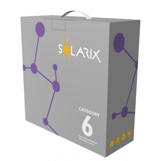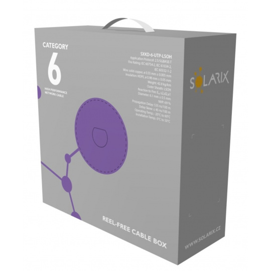 POZOR, nový 100 m box. Instalační kabel Solarix s označením SXKD-6-UTP-LSOH je spolehlivý nestíněný kabel kategorie 6, který je testován až do šířky pásma 450 MHz, a je určený pro provoz ethernetových protokolů, včetně 2.5GBASE-T a 5GBASE-T. Konstrukce kabelu je U/UTP s plastovým křížem, který zajišťuje maximální oddělení párů od sebe po celé délce kabelu. Typ pláště je LSOH s třídou reakce na oheň Dca-s2,d2,a1. Vodiče kabelu jsou vyrobeny z kvalitního měděného drátu s čistotou mědi 99,97 %. Kabel bez problémů splňuje požadavky z mezinárodních standardů ISO/IEC 11801, EN 50173 a ANSI/TIA 568.2-D. Výkonové parametry tohoto kabelu byly otestovány nezávislou testovací zkušebnou FORCE TECHNOLOGY v rámci programu EC Verified, a to na nejvyšší úroveň tzv. Component Level. Certifikát je k dispozici zde na webu v záložce "Odkazy" nebo přímo na stránkách laboratoře FORCE. V případě CPR (nařízení EU č. 305/2011) je kabel testován v systému posuzování vlastností AVCP 3. Stejně jako ostatní kabely Solarix, je i kabel SXKD-6-UTP-LSOH značen metráží po 1 m v rozsahu od 0 do 100 m. Kabel je dodáván ve vysoce odolném třívrstvém leštěném kartónovém boxu, na kterém jsou uvedeny všechny nezbytné produktové informace, včetně čárových kódů, výrobní šarže, popisu a nejdůležitějších technických parametrů.